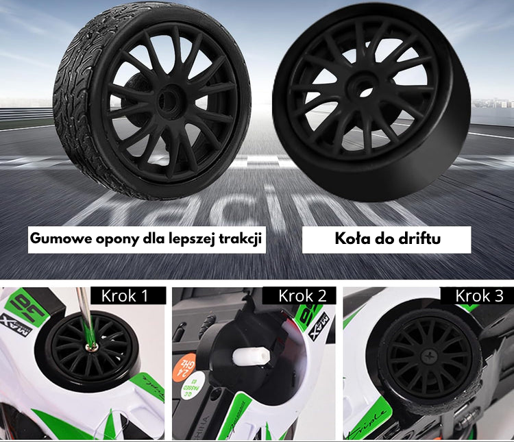Dzięki technologii 4WD, wymiennym oponom (Drift & Wyścig) oraz solidnej konstrukcji, pokonasz każdy zakręt.
